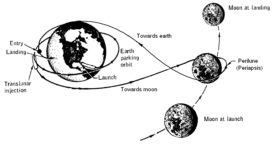 This is not a perfect launching site, but for missions to and back from the Earth Moon, it is sufficient. View the illustration on the right, that shows a mission to the Moon, first into Low Earth Orbit (LEO), then with a Translunar Injection (TLI) to the Moon.