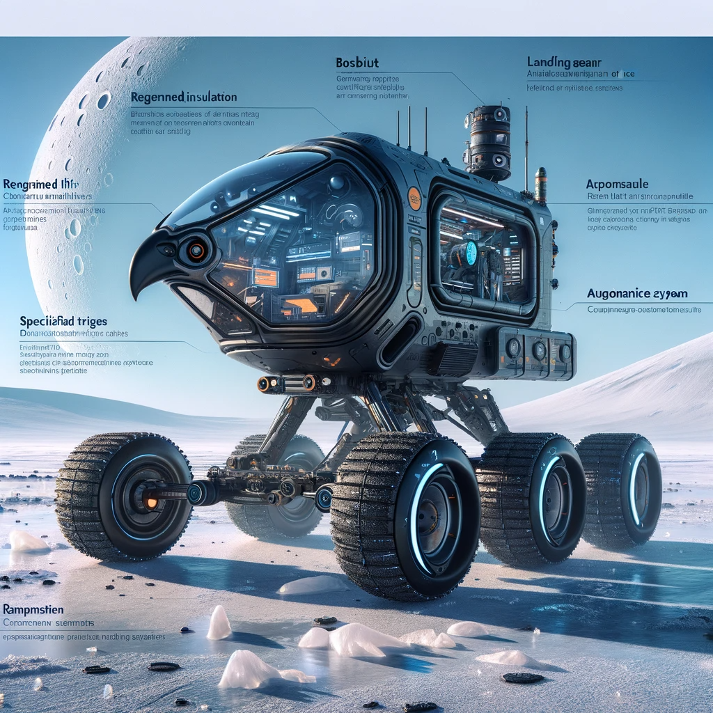 DALL·E 2023-12-26 17.34.59 – A futuristic land vehicle named ‘The Raven’, designed to resemble a raven, equipped for exploration on the icy surface of Saturn’s moon Enceladus. The