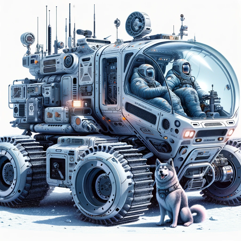 DALL·E 2023-12-26 17.44.56 – A futuristic snowcat-like vehicle equipped for the exploration of Saturn’s moon Enceladus. The vehicle has a sidecar for a dog, is heavily insulated,