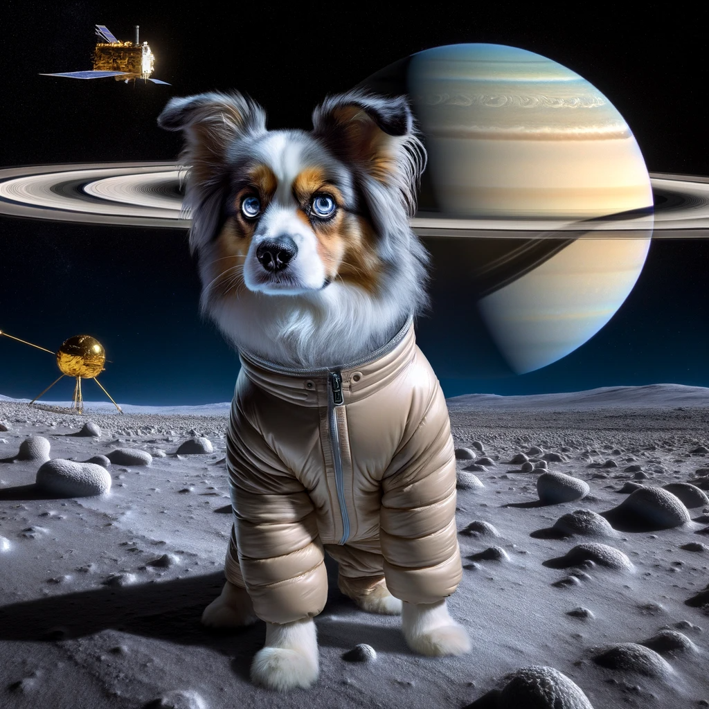 DALL·E 2023-12-26 18.06.39 – Monty, a Mini American Shepherd with hanging ears, wearing a special protective suit on the surface of Enceladus, the moon of Saturn. The suit is desi