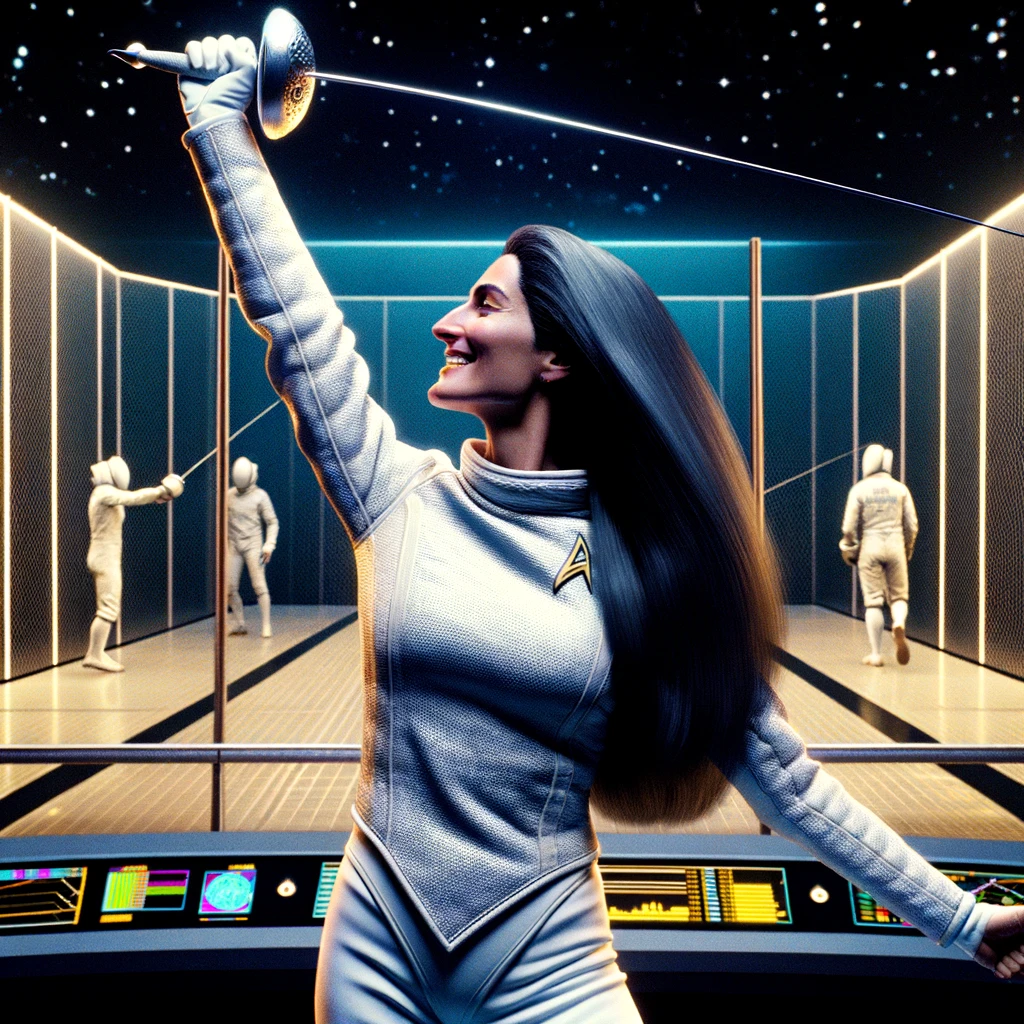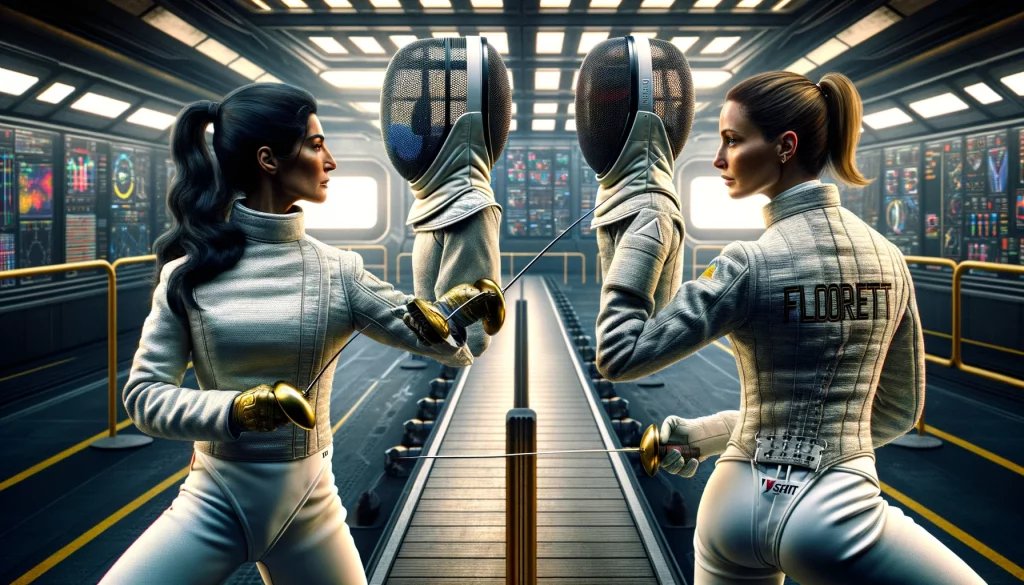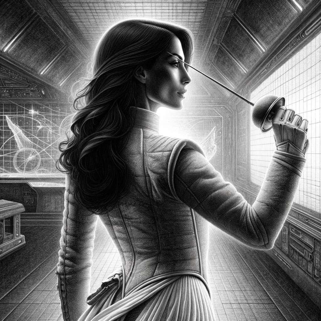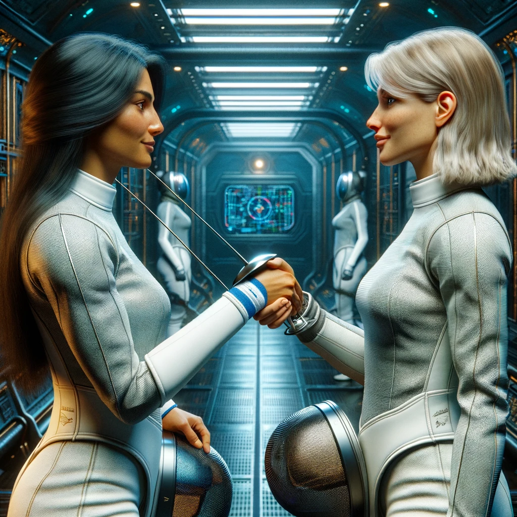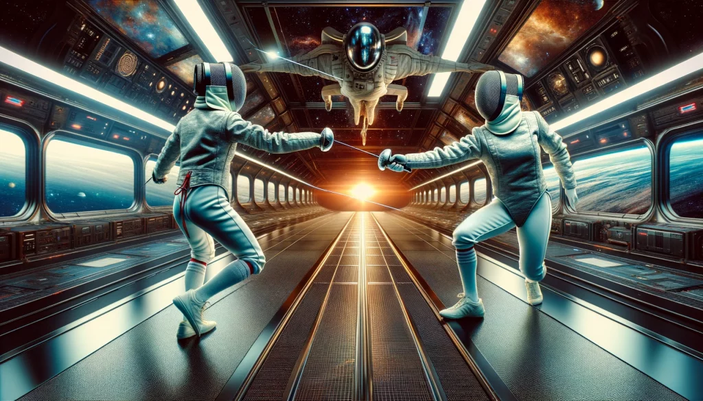 Amidst the backdrop of interstellar exploration aboard the Cosmic Galactic Cruiser, a unique spectacle of skill and grace unfolded on the Holodeck – the Foil Fencing Showcase. This event brought together two of the cruiser’s most adept fencers, EAH, the ship’s esteemed psychologist with a rich Persian heritage and a masterful command of the foil, and JKR, the young and spirited daughter of the commander, known for her agility and sharp strategic mind.