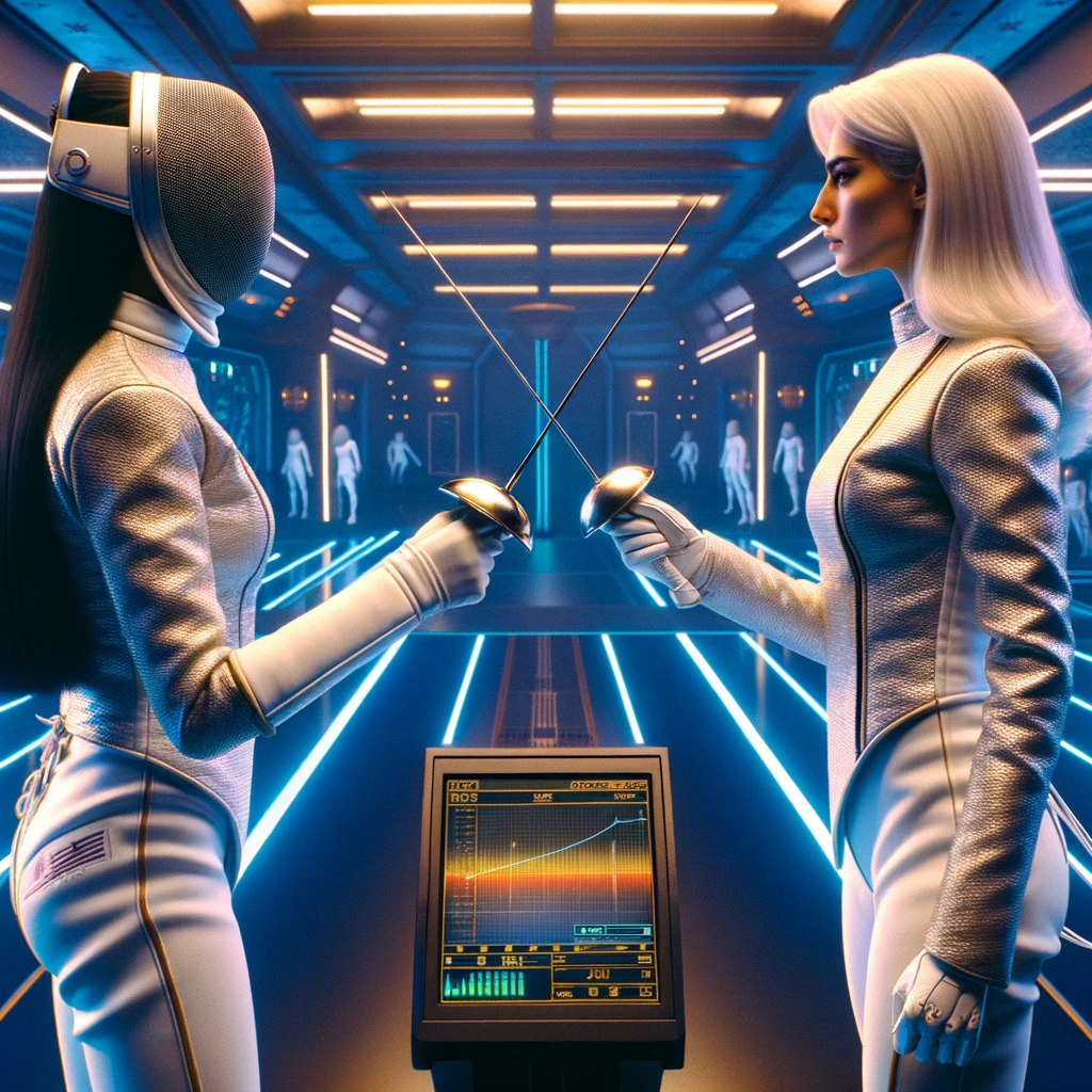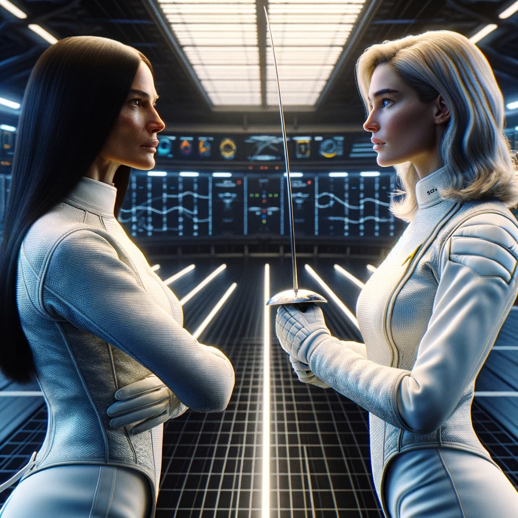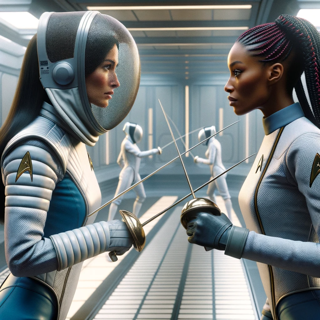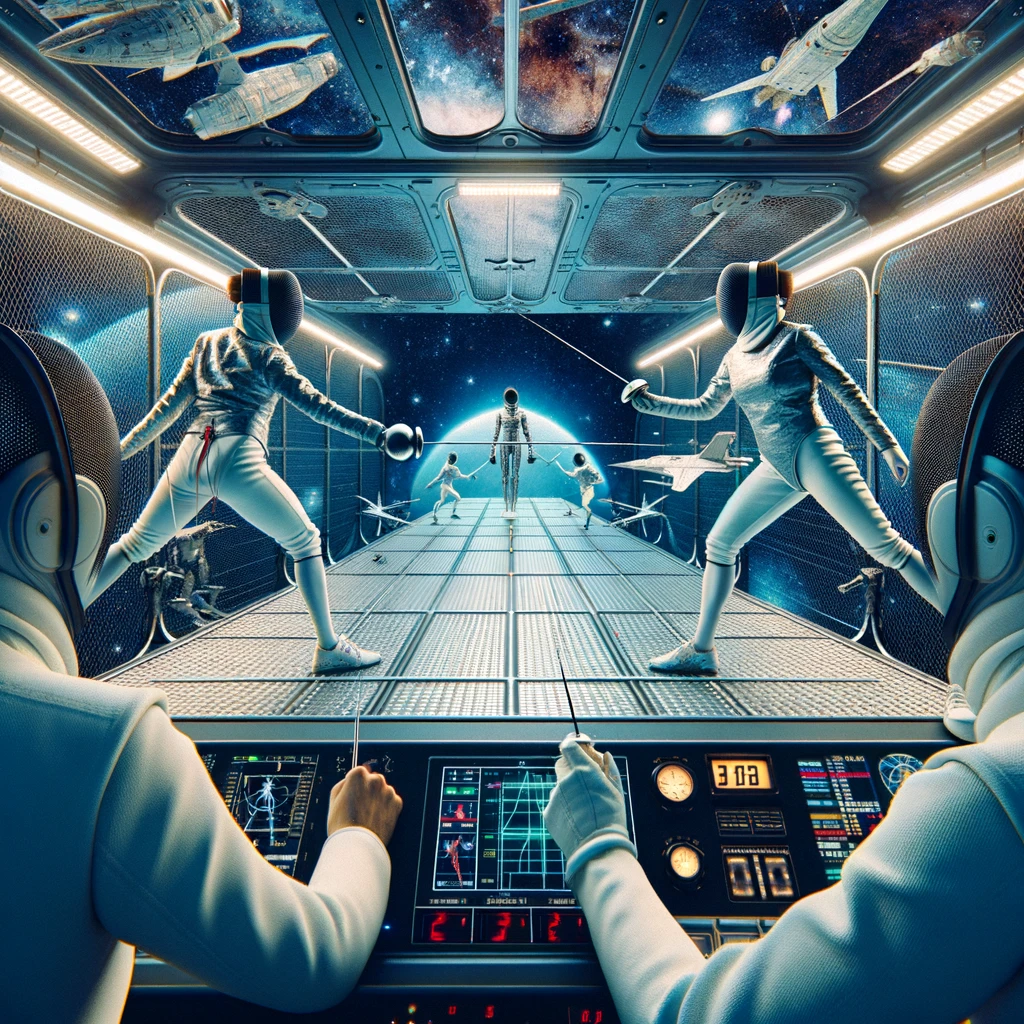 Amidst the backdrop of interstellar exploration aboard the Cosmic Galactic Cruiser, a unique spectacle of skill and grace unfolded on the Holodeck – the Foil Fencing Showcase. This event brought together two of the cruiser’s most adept fencers, EAH, the ship’s esteemed psychologist with a rich Persian heritage and a masterful command of the foil, and JKR, the young and spirited daughter of the commander, known for her agility and sharp strategic mind.