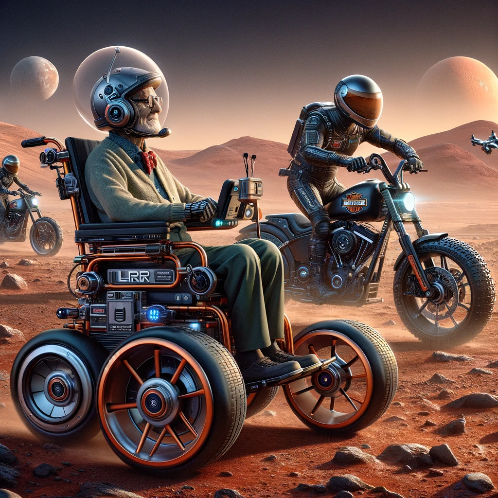 DALL·E 2023-12-26 11.05.35 – KR, a 90-year-old man, in a futuristic wheelchair named krBOT, using its all-terrain mode on Mars. He is accompanied by LCR and JRbw, both riding on f