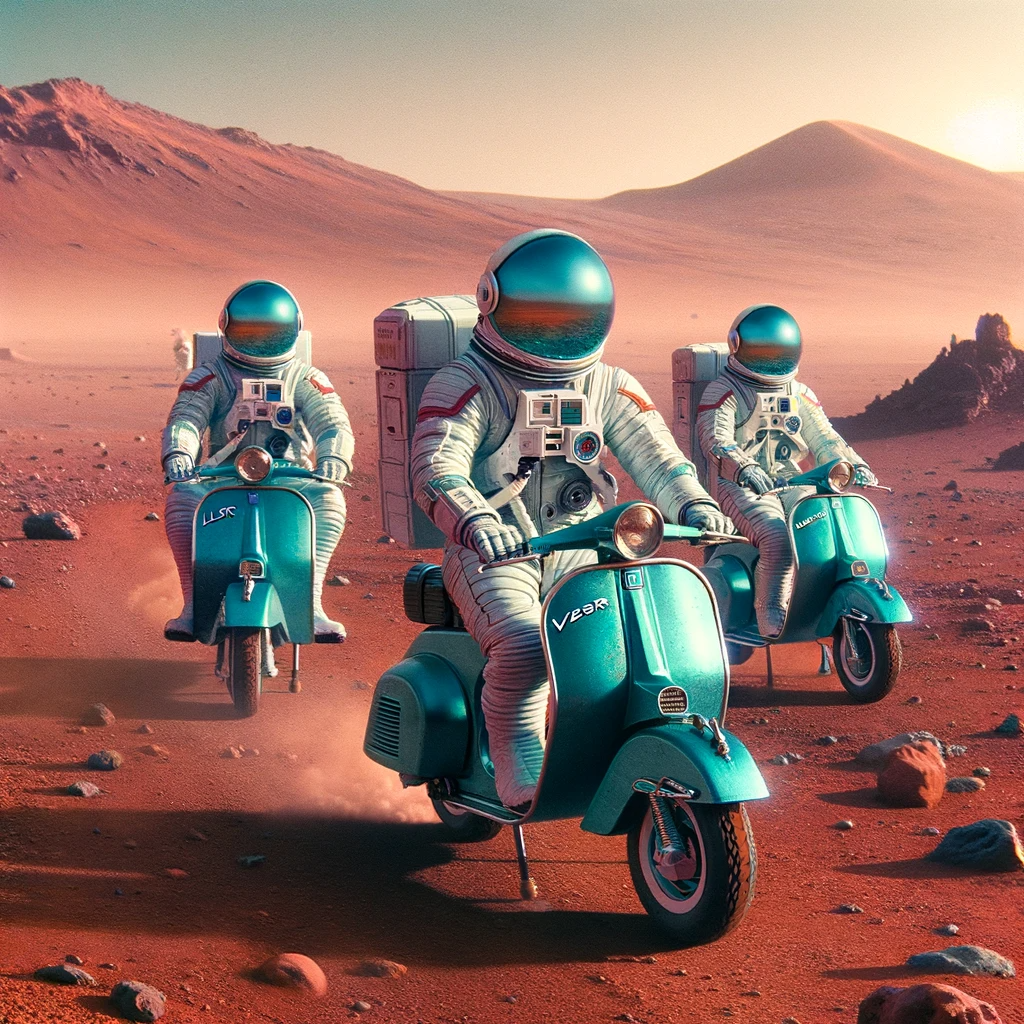 DALL·E 2023-12-27 13.32.00 – JKR, LCR, and JRbw, members of the Cosmic Galactic Cruiser crew, are embarking on a small excursion on Mars with their Vespa 946 scooter. They are all