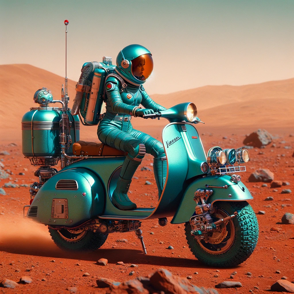 DALL·E 2023-12-27 13.59.37 – JKR, a member of the Cosmic Galactic Cruiser crew, is riding a modified Vespa 946 scooter on the surface of Mars. The scooter has been adapted for the